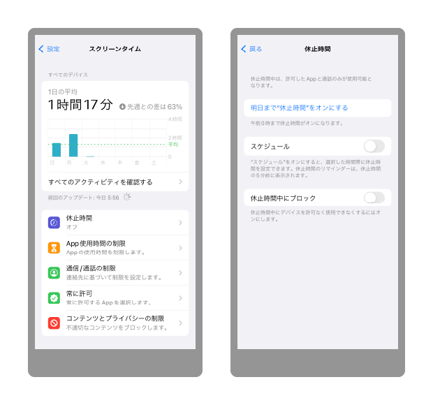 iPhoneの「スクリーンタイム」には「休止時間」があり、オンにすると自分でオフにするか、明日の午前0時まで電話など必要最小限の機能以外は利用できなくなります。スケジュールを決めて設定することもできます。