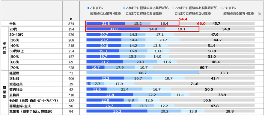 なかでも20代は66%もの人が未経験の職種や業種への転職・就職を希望しており、全年代で最も多い結果となりました。30代になると同割合は55.8%となるため、20代と30代の間の大きな差が見て取れます。