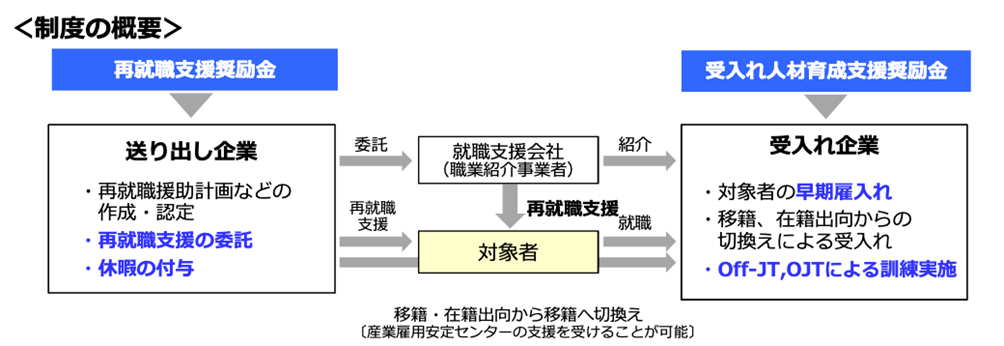 職活動のために休暇を与えた費用の一部が助成されます。受け入れ企業に対しては、受け入れ人材育成支援奨励金が支給されます。