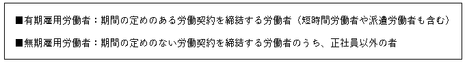 なお、キャリアアップ助成金の多くは、以下の有期雇用労働者および無期雇用労働者が対象となっています。本記事では、両者をまとめて「有期雇用労働者等」と記載します。