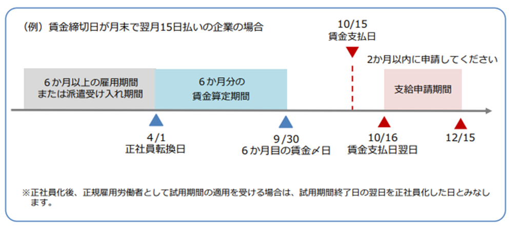 キャリアアップ計画どおりに取り組みをおこなっても、期限までに支給申請をしなければ助成金をもらうことはできません。正社員などへの転換または直接雇用した対象労働者に対し、転換・雇用後の賃金を6ヶ月分支給した日の翌日から起算して2ヶ月以内に申請をすることが条件です。