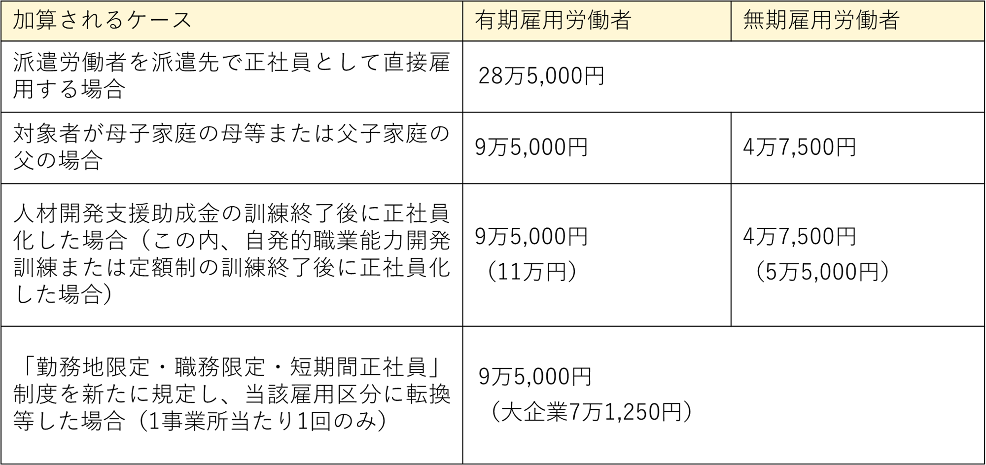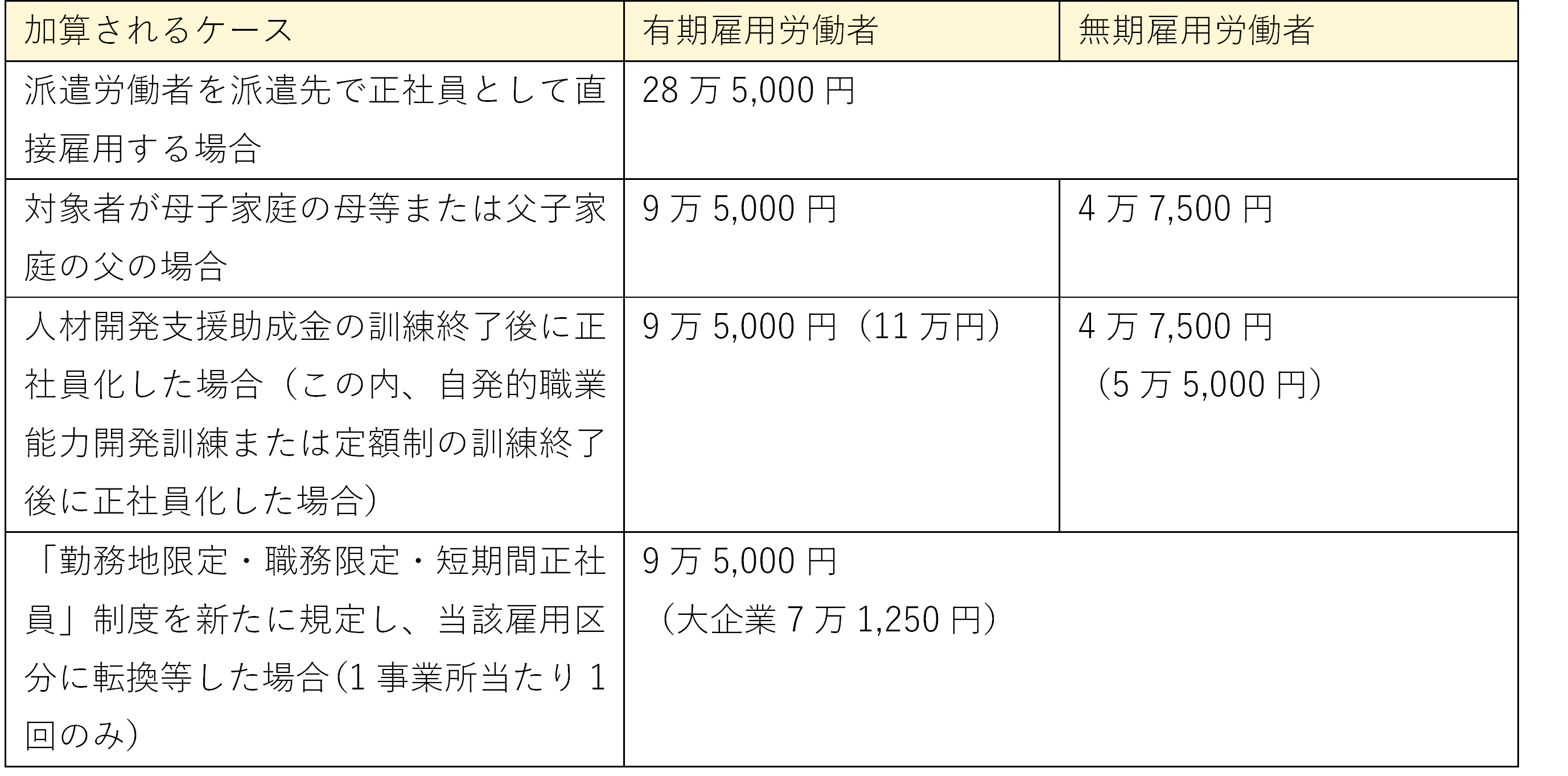※上記の表は有期雇用から正規雇用へ転換した場合の金額です。無期雇用から正規雇用への転換の場合、助成額が半額になります。