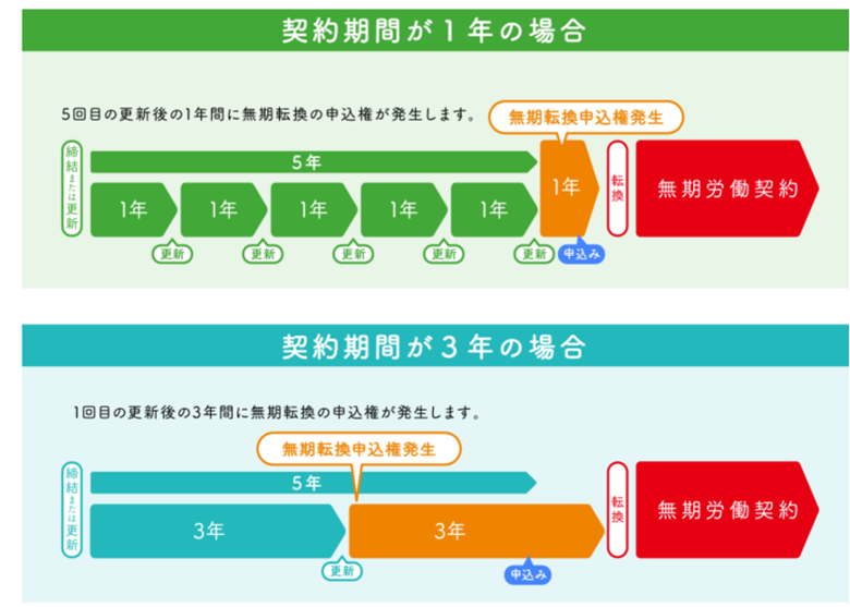 例えば、2013年4月以降に1年契約を繰り返して更新し、通算契約期間が5年を超えた場合に、労働者には無期転換を申し込む権利が発生します。前述のとおり、クーリング期間(6ヶ月以上の空白期間)がある場合、それ以前は通算に含みませんが、6ヶ月未満の一時的な中断については、同一事業主との契約であれば通算期間に加算されます。