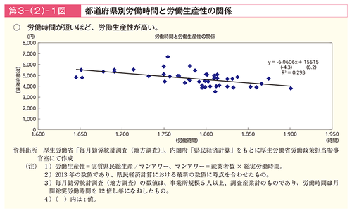 厚生労働省の「平成29年版 労働経済の分析 -イノベーションの促進とワーク・ライフ・バランスの実現に向けた課題-」の調査結果によると、労働時間が短い国ほど労働生産性が高くなっています。国内の都道府県別のデータでも、労働時間の短い都道府県ほど労働生産性が高いという関係が見られます。