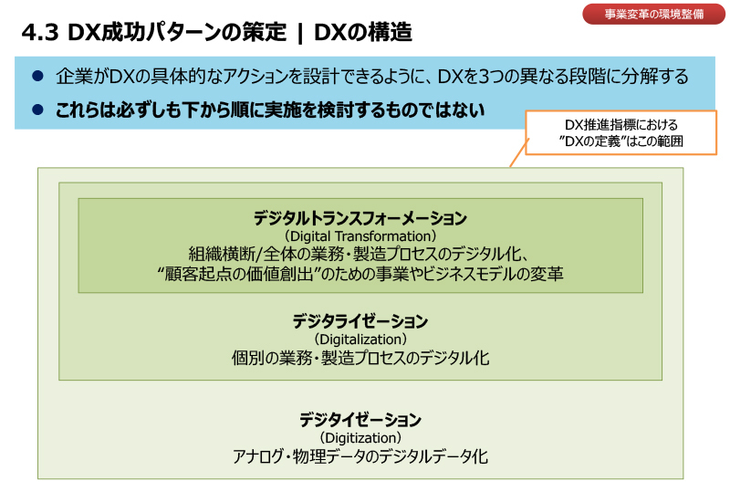 DXと似た用語として、デジタイゼーション(Digitization)やデジタライゼーション(Digitalization)も存在します。混同しやすいのですが、経済産業省の取りまとめたレポートに記載されている以下の図を頭に入れておくと理解しやすいのではないでしょうか。