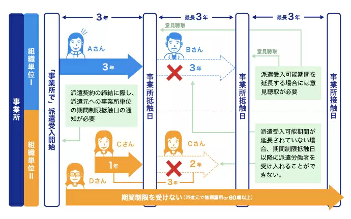 ひとりの派遣スタッフが、同じ事業所のひとつの組織単位で働くことのできる派遣期間の抵触日のことです。
