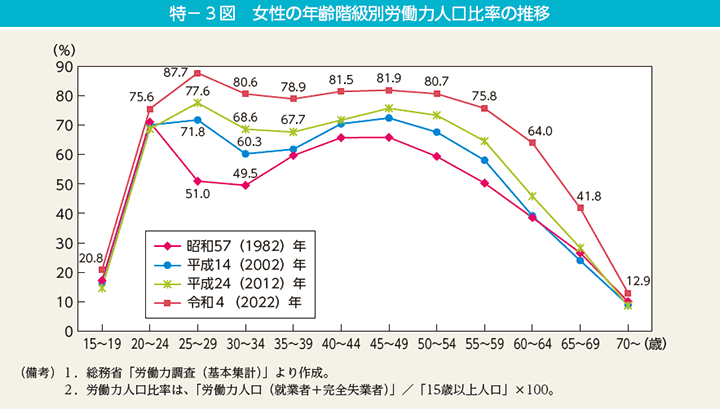内閣府調査「女性の年齢階級別労働力率の推移(男女共同参画白書 令和5年版より)」(2024年1月時点)https://www.gender.go.jp/about_danjo/whitepaper/r05/zentai/html/zuhyo/zuhyo00-03.html