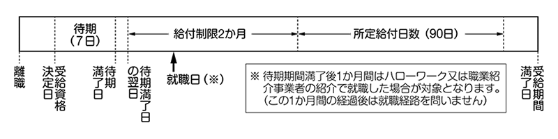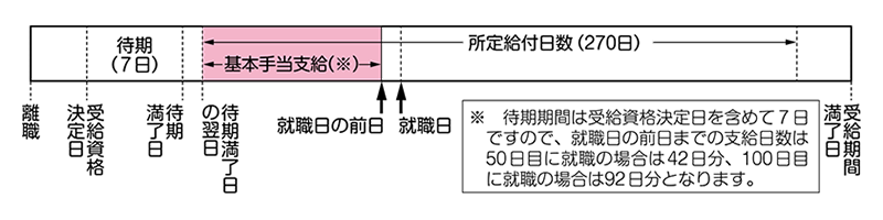 (※1)待機期間は受給資格決定日を含めて7日ですので、就職日の前日までの支給日数は50日目に就職の場合は42日分、100日目に就職の場合は92日分となります。